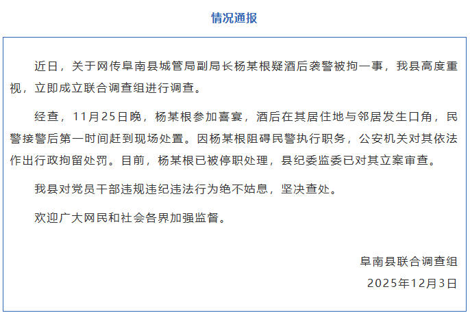 央视新闻:据“阜南发布”公众号报道,12月3日,阜南县联合调查组发布情况通报:近日,网上有传言称,阜南县城管局副局长杨某根因涉嫌醉酒袭警被刑事拘留。我县对此高度重视,立即成立联合调查组展开调查。经调查发现,11月25日晚,杨某根醉酒参加婚宴,在住处与邻居发生争执。警方接到报警后第一时间赶赴现场。因杨某根妨碍民警依法执行职务,公安机关依法积极给予行政限制处分。目前,杨某根已被停职,县纪委监委n 已对他提起诉讼进行调查。我县对党员干部违法违规行为绝不姑息,坚决查处。欢迎广大网友和社会各界加强管理。